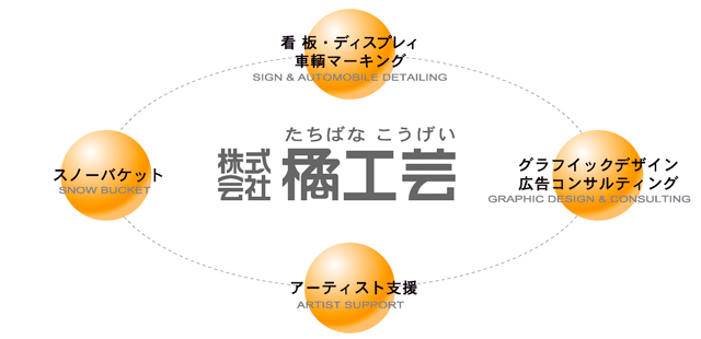 株式会社 橘工芸は、「看板、ディスプレー、車輌マーキング」 「グラフィックデザイン」 「スノーバケット」の3本柱で構成されております。    看板では、基礎工事、鉄骨加工から製作、取付工事まで一貫で行っております。    「グラフィックデザイン」では、多摩美術大学グラフィックデザイン専攻卒業の社長自らディレクションをし、デザイン・設計のみならずブランディングの見地から広告効果を徹底検証します。看板とグラフィックデザインの融合により、お店や会社のオープンに広告のワンストップ・カンパニーとして重宝されております。    企業・商品ブランディングを中心に、ディスプレーデザイン、さらにはライフワークのボディビルを生かして、カラダデザイン「ダイエット指導」も行っております。街の景観を構成する3要素は「建築」「造園」「看板」ですが、一番大切な要素は人です。その人を美しくするためのカラダデザインになります。より美しい景観を創り出すための事業になります。    「スノーバケット」は、わざわざ高額な除雪車・除雪機を買わなくても、お手持ちのスタンダードフォークリフトで、本格的な除雪作業が低コストでできます。豪雪の新潟県ならではの商品です。朝、目覚めて大雪で「しまった!」とならないためにも、1台をお薦めいたします。
